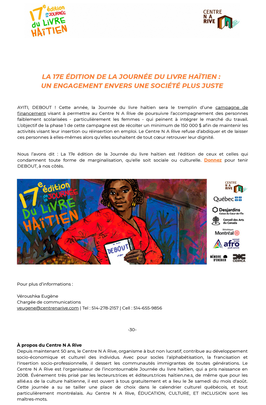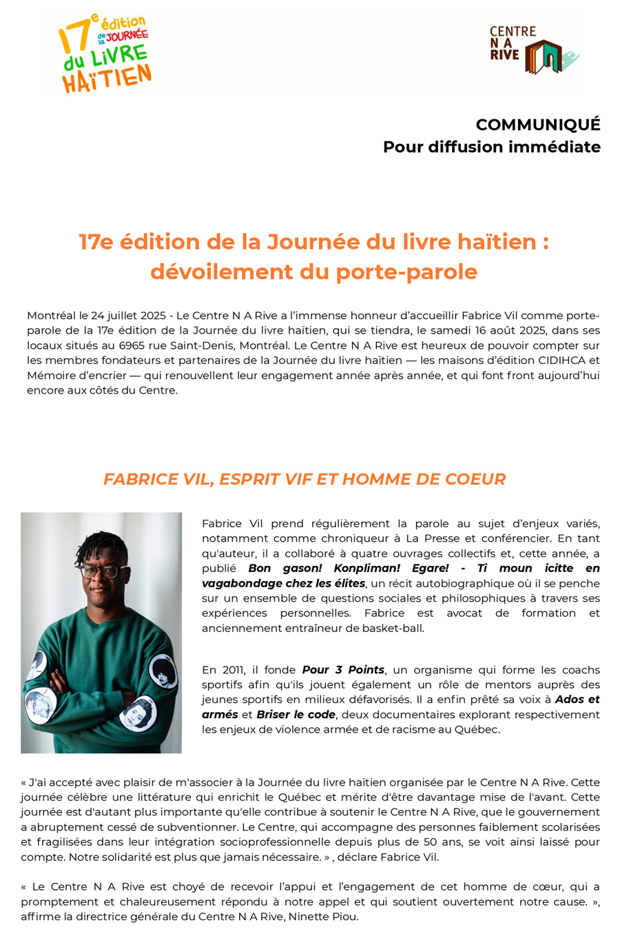 Montréal le 24 juillet 2025 – Le Centre N A Rive a l’immense honneur d’accueillir Fabrice Vil comme porte-parole de la 17e édition de la Journée du livre haïtien, qui se tiendra, le samedi 16 août 2025, dans ses locaux situés au 6965 rue Saint-Denis, Montréal. Le Centre N A Rive est heureux de pouvoir compter sur les membres fondateurs et partenaires de la Journée du livre haïtien — les maisons d’édition CIDIHCA et Mémoire d’encrier — qui renouvellent leur engagement année après année, et qui font front aujourd’hui encore aux côtés du Centre.